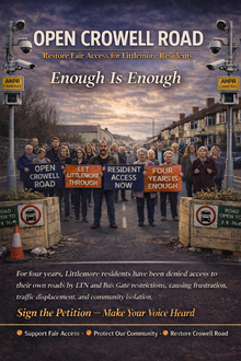 OPEN CROWELL ROAD-Restore Fair Access For Littlemore ResidentsWhy Others Should Join the Campaign to Restore Access to Crowell Road 1. It’s About Fairness for Everyone This isn’t about politics — it’s about fairness. Residents should not be cut off from their own neighbourhood, forced into long diversions, or treated differently from those living just streets away. Fair access is a basic expectation. 2. The Impact Goes Beyond One Road The closure doesn’t just affect Crowell Road — it pushes traffic onto surrounding streets like Newman Road, increasing: Congestion • Pollution in residential areas • Noise and stress for families • Road safety risks When one road is blocked, the whole community feels it. 3. Vital Access Has Been Restricted For four years, residents have faced delays reaching: • Work and schools • Doctors and pharmacies • Shops and local services • Elderly relatives and carers This affects daily life — especially for the elderly, disabled, and families with children. 4. Community Voices Deserve to Be Heard Many residents feel decisions were made to them, not with them. Joining the campaign sends a clear message: 👉 Local people deserve a say in decisions that shape their lives. 5. A United Community Gets Results History shows that when communities stand together: • Reviews happen • Policies are reconsidered • Fairer solutions are found Change doesn’t come from silence — it comes from collective action. 6. This Is About Improving, Not Dividing The campaign is not about removing safety or environmental goals. It’s about finding balanced solutions that: • Protect neighbourhoods • Maintain fair access • Work for everyone Simple Call to Action Join us if you believe: • Residents deserve fair access • Decisions should reflect community needs2 of 100 SignaturesCreated by Anne Stares