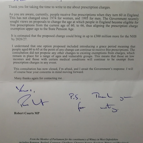 The Government has decided that the prescription charge upper age exemption will remain at 60, meaning that it will not align to the State Pension age. https://www.gov.uk/government/consultations/aligning-the-upper-age-for-nhs-prescription-charge-exemptions-with-the-state-pension-age/outcome/aligning-the-upper-age-for-nhs-prescription-charge-exemptions-with-the-state-pension-age-government-response#introduction