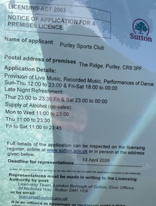 Purley Sports Club application for outdoor music and alcohol license