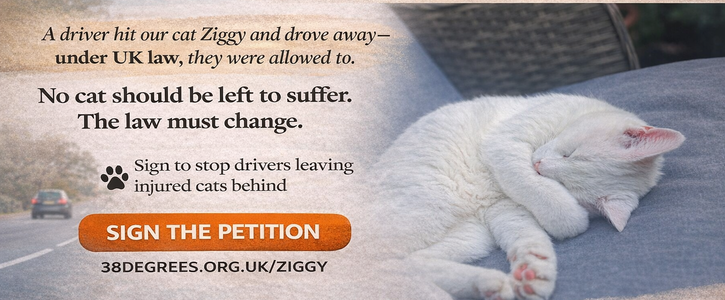 Current law requires drivers to stop and report collisions with dogs and farm animals, but not cats. We want the law changed so that if you hit a cat you must legally stop and report it to the nearest vets.